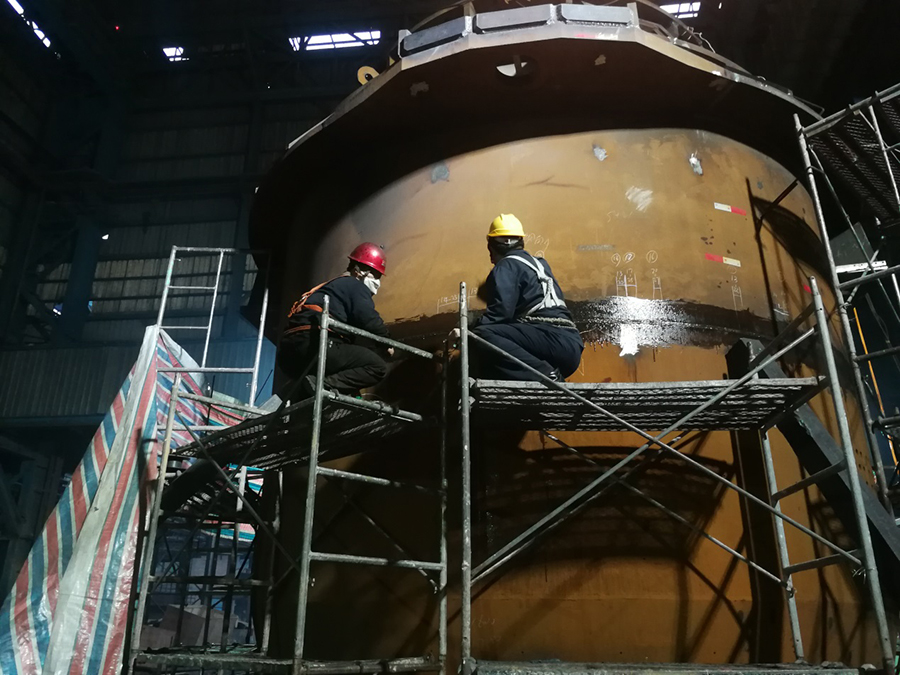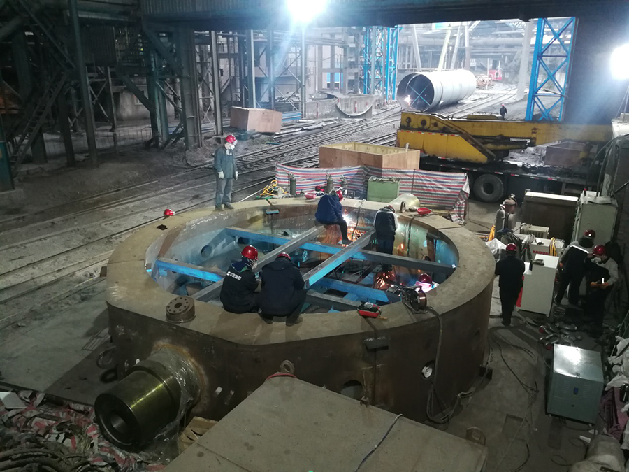 時(shí)間就是效益,滿足客戶需求,讓客戶滿意是遼寧方大集團(tuán)北方重工全體員工的共同目標(biāo)。為盡快完成轉(zhuǎn)爐項(xiàng)目現(xiàn)場(chǎng)施工,給用戶創(chuàng)造價(jià)值,焊接工人連續(xù)工作,質(zhì)檢、探傷人員緊密配合,每天早七晚十,持續(xù)作業(yè)?,F(xiàn)場(chǎng)服務(wù)人員在爐腔內(nèi)施工,作業(yè)空間密閉、狹小,但為保證質(zhì)量、節(jié)省時(shí)間,他們經(jīng)?!霸苯惑w半個(gè)小時(shí)不出來(lái)。寒冬季節(jié),當(dāng)他們從爐體鉆出來(lái)時(shí),單衣已被汗水打透。上下爐殼接口內(nèi)部焊縫焊接位置被支撐遮擋,大家只能半爬半跪的窩在支撐上進(jìn)行焊接。每前進(jìn)一步都需要用“膝蓋當(dāng)腳,一步一跪”的完成焊接工作,他們就是這樣用膝蓋丈量了整個(gè)內(nèi)部環(huán)縫的長(zhǎng)度。