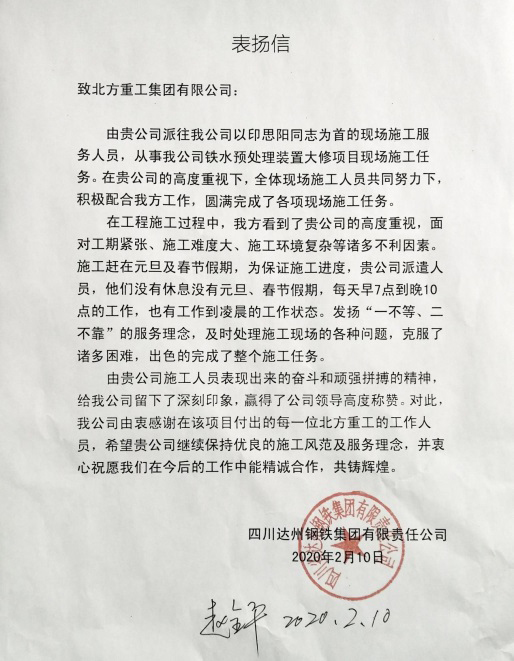 歷時(shí)34天,出色完成四川達(dá)鋼轉(zhuǎn)爐改造項(xiàng)目,順利通過(guò)用戶驗(yàn)收,遼寧方大集團(tuán)北方重工安裝人員以嚴(yán)謹(jǐn)?shù)墓ぷ鲬B(tài)度,飽滿的工作熱情,高超的技術(shù)水平得到了用戶的贊揚(yáng)和肯定。